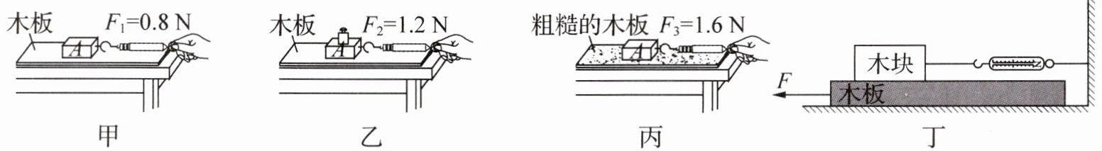 (3) 同学们在实验中还发现,拉着木块运动时很难控制“匀速”,于是小芳同学将实验方法进行了改进,实验装置如图丁所示,将弹簧测力计固定,改为拉动木板。当她水平向左拉动木板时,木块所受到的摩擦力的方向为水平