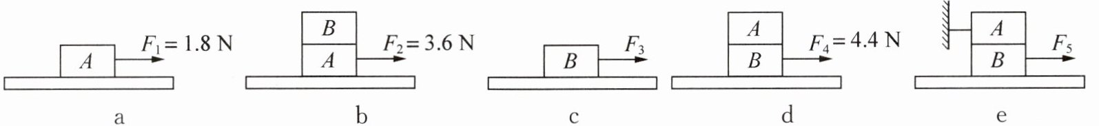 ;已知 $ A $、$ B $ 两个木块之间的动摩擦因数大小为 $ 0.4 $,在如图 $ e $ 所示实验中,若先将木块 $ A $ 固定不动,再用拉力 $ F_{5} $ 将木块 $ B $ 匀速抽出,则拉力 $ F_{5} $ 的大小为