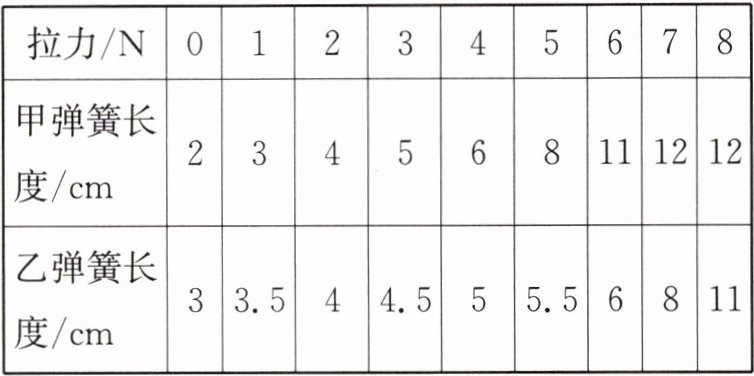 5. 学校科技活动小组的同学们准备自己动手制作弹簧测力计,他们选取了甲、乙两种规格的弹簧进行测试,测试结果如表。根据记录情况判断: