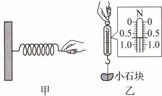 (选填“大”或“小”),弹簧的弹性形变就越大,根据此原理制成了测量力的工具弹簧测力计(如图乙所示),即用弹簧的弹性形变的大小间接反映力的大小,则图乙中小石块的重力是