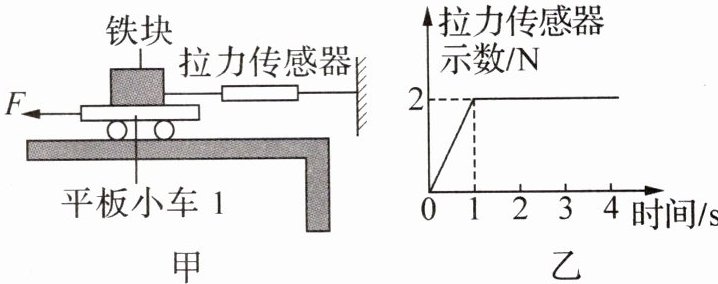 步骤一:如图甲所示,小轩用水平向左的拉力F拉动放在水平面上的平板小车1,观察并记录4s内拉力传感器的示数,绘制了如图乙所示的图像;