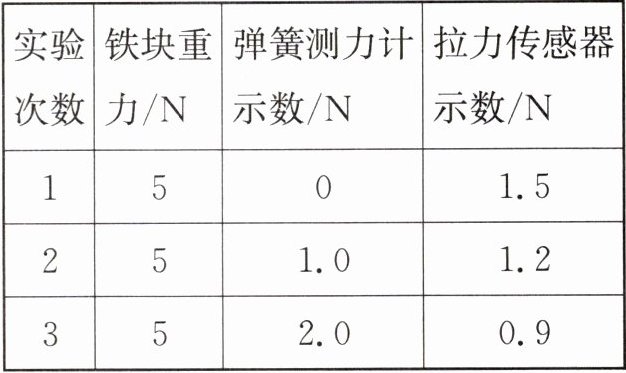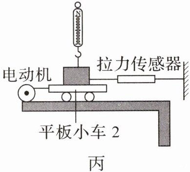 步骤二:将同一铁块以同种方式放置在平板小车2上,如图丙,用电动机向左水平拉动放在水平面上的平板小车2,再用弹簧测力计竖直向上拉铁块,读出弹簧测力计和拉力传感器的示数,记录在表格中。