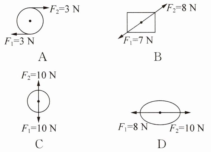 D选项:两个力大小不相等($8\,\mathrm{N}$和$10\,\mathrm{N}$),不符合。