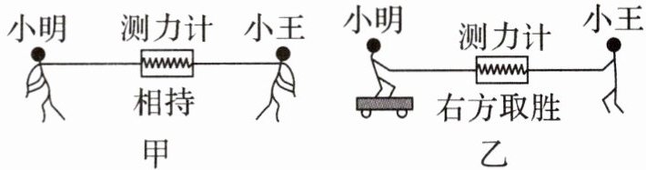 11. 如图甲所示,小明和小王两人站在水平地面上,分别用150N的拉力拉绳,结果两人正好处于相持状态;如图乙所示,小明站在一平板小车上,小王站在地面上,两人用90N的拉力拉绳,小明同学被小王匀速向右拉动,甲乙两图中整个过程不计绳及弹簧测力计自重,则下列说法正确的是 (