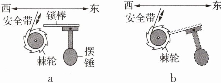 答案:6. D 解析:由于摆锤具有惯性,会保持原来的运动状态,由b图可知,摆锤向右摆动,则可能是汽车向西加速运动或向东减速运动(紧急刹车),锁棒锁定棘轮,安全带不能被拉动,故D符合题意.