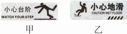 5. (2025·江苏苏州期末)如图所示,两个标志牌显示了当人遇到台阶或湿滑地面时的摔倒方向.在两幅图中,人身体下半身比上半身速度大的是图
