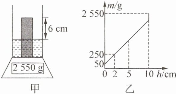 11. (2025·江苏苏州期中)一个底面积为 $ 100 \mathrm{ cm}^2 $ 的薄壁柱形容器放在水平电子秤上,向容器中缓慢注入液体,停止注入液体时容器中液体的深度为 $ 5 \mathrm{ cm} $;将均匀实心柱体缓慢放入液体中,放手后,柱体静止时电子秤的示数为 $ 2550 \mathrm{ g} $,如图甲所示;整个过程,电子秤的示数与容器内液体深度的关系如图乙所示(部分数据没有标识)。下列说法正确的是(