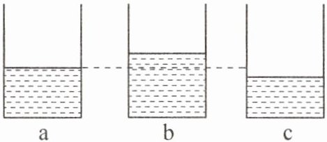 由题意知,a、b、c三个杯子完全相同,初始水面高度不同,设初始水体积为$V_{a水}$、$V_{b水}$、$V_{c水}$,且由图可知$V_{b水}>V_{a水}>V_{c水}$。