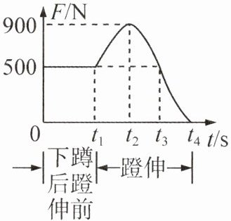 答案:6. 500 $t_3$ 解析:由图可知,运动员下蹲后、蹬伸前(图中$0∼ t_1$时间段)处于静止状态,受力平衡,则运动员受到的重力和支持力大小相等,由图像可知,运动员的重力$G=F=500\ \mathrm{N}$.运动员受到地面的支持力$F$方向竖直向上,运动员的重力$G$方向竖直向下,由图像可知,$t_1∼ t_3$时间段,$F>G$,则运动员所受合力向上,做加速运动,速度增大;$t_3∼ t_4$时间段,$F<G$,运动员受到的合力向下,由于具有惯性,运动员仍会继续向上运动,但是向上的速度会减小.所以$t_1∼ t_3$时间段,运动员的速度一直增大,$t_3∼ t_4$时间段速度减小,则运动员在$t_3$时刻获得向上的速度最大.