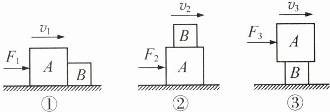 3. (2025·江苏南京一模)如图,A 和 B 两个材料相同的正方体分别以①、②、③三种方式放置在相同的水平桌面上做匀速直线运动,其速度关系是 $ v_{1} < v_{2} < v_{3} $. 则三种情况下推力 $ F_{1} $、$ F_{2} $、$ F_{3} $ 的大小关系为