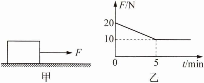 答案:15.14 10 不会 解析:由$F - t$图像可知,0~5min内木块受到的拉力匀速减小,5min内由20N减小到10N,即5min减小了10N,故3min时,拉力减小6N,为20N - 6N = 14N;第5min后,木块做匀速直线运动,受平衡力的作用,则拉力和摩擦力大小相等,由图乙可知,$f = F = 10N$,压力大小与接触面的粗糙程度不变,则第3min时木块受到的滑动摩擦力也为10N;撤去拉力后,木块由于具有惯性,不会立即停止运动.