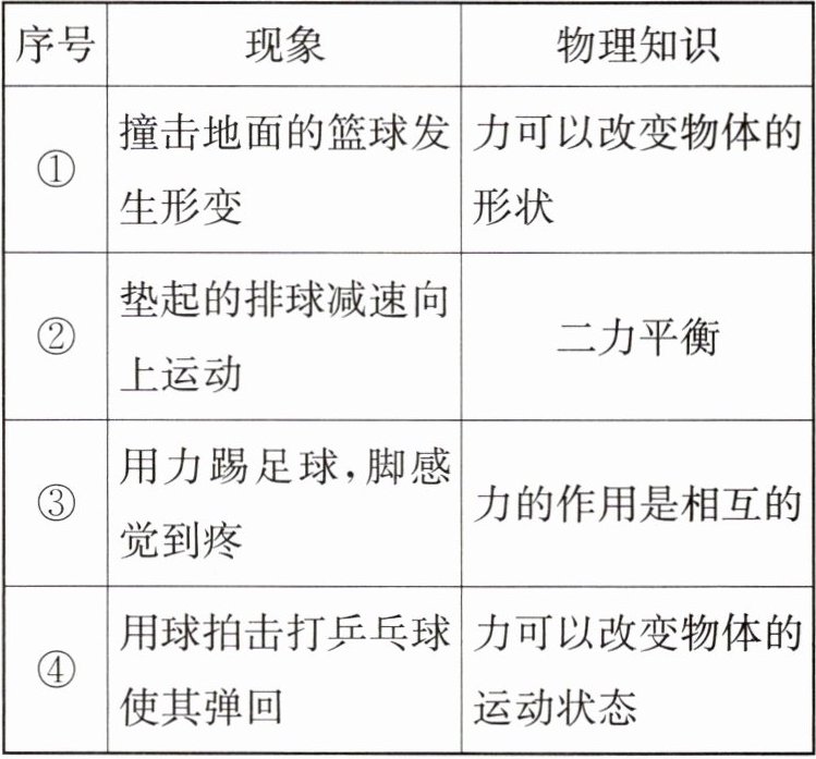 11. (2025·天津)小明用物理知识对球类运动中的现象进行分析,如下表所示. 所用物理知识错误的是 (