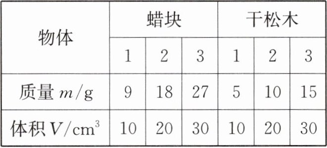 (1)在如图所示的方格坐标系中,蜡块和干松木的质量随体积变化的情况已表示出其中一种,请将另一种物质的变化情况在图中表示出来。