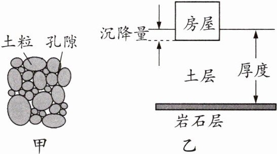 建在地面的房屋往往会面临地基沉降的问题,意大利比萨斜塔就是因为地基沉降不均匀而倾斜的. 房屋下方的地层通常包括土层和岩石层. 岩石风化、脱落形成的细小颗粒称为土粒,土粒很坚硬,很难被压缩,但土粒之间有很多孔隙,如图甲所示,土层由土粒和土粒间的孔隙构成. 土中孔隙的总体积和土粒的总体积之比称为土的孔隙比 $ e $,与坚固的岩石层不同,外加压力时,土粒会发生移动,重新排列、靠紧,土的体积就变小了. 如图乙所示,房屋对下方地层的压力很大,土层被压缩,就造成了房屋的地基沉降,因此在建造房屋之前要勘测地层,预估地基的沉降量.