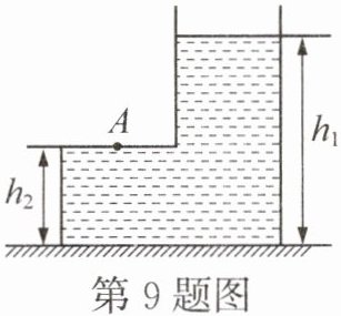 9. 如图所示,轻质容器内装有 5 kg 酒精,容器底面积为 150 cm²,容器放在水平桌面上,桌面面积为 1.2 m²,图中 $ h_{1} = 1 $ m,$ h_{2} = 35 $ cm,g 取 10 N/kg,$ \rho_{酒精} = 0.8 $ g/cm³,则酒精对 A 点的压强为