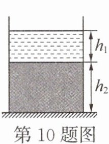 10. 如图所示,装有两种不同液体的烧杯置于水平面上,两种液体没有混合.上层液体的密度为 0.8 g/cm³,下层液体是水,水的密度为 1.0 g/cm³、高度 $ h_{2} = 10 $ cm.已知烧杯的底面积为 100 cm²,烧杯中的液体对烧杯底部的压力为 14 N,g 取 10 N/kg,则上层液体的高度 $ h_{1} $=