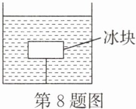 答案:8. D 解析:冰熔化成水,状态变化,质量不变,水的密度大于冰的密度,由 $\rho = \frac{m}{V}$ 可知,冰熔化为水后的体积小于冰的体积,所以冰熔化过程中水面下降,由 $p = \rho_{液} gh$ 可知,容器底部受到水的压强减小。设冰熔化的质量为 $m$,则冰熔化成水减小的体积 $\Delta V = V_{冰} - V_{冰化水} = \frac{m}{\rho_{冰}} - \frac{m}{\rho_{水}} = m(\frac{1}{\rho_{冰}} - \frac{1}{\rho_{水}})$,水面下降的高度 $\Delta h = \frac{\Delta V}{S} = \frac{m}{S}(\frac{1}{\rho_{冰}} - \frac{1}{\rho_{水}})$,则水对容器底部的压强减小 $\Delta p = \rho_{*} g \Delta h = \rho_{*} g \frac{m}{S}(\frac{1}{\rho_{冰}} - \frac{1}{\rho_{水}}) = \frac{V_{*}}{S} g (\rho_{*} - \rho_{冰})$,由于水的密度、冰的密度、容器底面积和 $g$ 值都是定值,所以容器底部受到水的压强随着冰熔化体积的增大而均匀减小,其图像为一条斜向下的直线,故 D 正确。