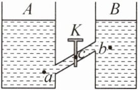 答案:6. C 解析:两容器中装有同种液体,液面高度相同,阀门K打开前a、b两点所处深度$h_{a}>h_{b},$由$p = \rho_{液}gh$可得$,p_{a}>p_{b},$故A错误;A、B两容器中的液体在c点的深度相同,由$p = \rho_{液}gh$可知,阀门c点左、右受到的液体压强相等,故B错误;阀门打开后,A和B的上端开口、底部连通,构成了连通器,由于容器中装有同种液体,并且液面相平,因此打开阀门K后,液面仍保持相平,液体不会流动,故C正确、D错误.