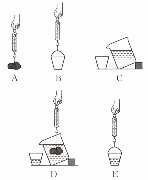 13. 为验证阿基米德原理,小明用弹簧测力计、小石块、烧杯、小桶、水、细线、垫块等进行操作,实验步骤如图 A、B、C、D、E 所示。