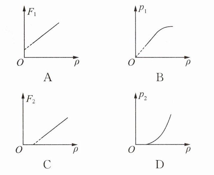 容器总重力$G_{\mathrm{总}}=G_{\mathrm{容器}}+G_{\mathrm{盐水}}+G_{\mathrm{木}}$,其中$G_{\mathrm{盐水}}=\rho V_{\mathrm{盐水}}g$,则$p_2=\frac{G_{\mathrm{总}}}{S}=\frac{G_{\mathrm{容器}}+G_{\mathrm{木}}}{S}+\frac{\rho V_{\mathrm{盐水}}g}{S}$,$p_2$与$\rho$成正比,图像为不过原点的倾斜直线(因存在常数项)。