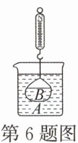 答案:6.D 解析:若$\rho_{A}=\rho_{B}$,当袋内液面与袋外液面相平时,袋内液体B的体积等于排开液体A的体积,即$V_{B}=V_{排}$,袋内液体B的重力$G_{B}=\rho_{B}V_{B}g$,塑料袋受到的浮力$F_{浮}=\rho_{A}V_{排}g=G_{B}$,则测力计示数$F=G_{B}-F_{浮}=0$,故①正确;若$\rho_{A}>\rho_{B}$,当F为零时,塑料袋受到的浮力等于B的重力,即$F_{浮}=G_{B}$,$\rho_{A}V_{排}g=\rho_{B}V_{B}g$,因为$\rho_{A}>\rho_{B}$,所以$V_{排}<V_{B}$,则此时袋内液面高于袋外液面,故②正确;若$\rho_{A}<\rho_{B}$,当袋内液面与袋外液面相平时,$V_{B}=V_{排}$,则$\rho_{A}V_{排}g<\rho_{B}V_{B}g$,即$F_{浮}<G$,弹簧测力计示数$F=G-F_{浮}>0$,则F不为零,故③正确.综上所述,D正确.