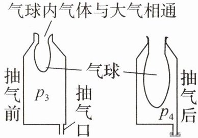 解:抽气前,气球内气体与大气相通,气球内气压$p_1$等于大气压;瓶内气压$p_3$也等于大气压,即$p_1 = p_3$。
