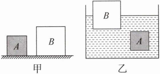 3. 如图甲所示,将质量相等的两个实心正方体 A 和 B 放在水平地面上,它们对水平地面的压强 $ p_{A} \_\_\_\_\_ p_{B} $;当它们在水中分别静止于图乙所示的位置时,受到水的浮力 $ F_{浮A} \_\_\_\_\_ F_{浮B} $,下表面受到水的压强 $ p'_{A} \_\_\_\_\_ p'_{B} $,下表面受到水的压力 $ F_{A下} \_\_\_\_\_ F_{B下} $。(均选填“>”“=”或“<”)