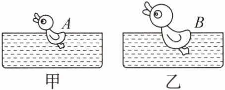 1. (2025·安徽安庆期末)如图所示,装满水的甲、乙两个相同水槽,放在水平桌面上。甲水槽内放一个质量较小的玩具鸭子 A,乙水槽内放一个质量较大的玩具鸭子 B,则下列说法正确的是(