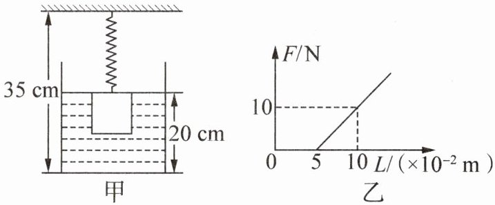 5. (2025·四川南充)如图甲所示,一轻质弹簧上端固定,下端连接正方体物块,物块上表面恰与水面相平,物块的棱长为 10 cm,水深为 20 cm,弹簧的上端与容器底部之间的高度为 35 cm,弹簧弹力 F 与长度 L 的关系如图乙。下列选项正确的是(ρ₍水₎ = 1.0×10³ kg/m³,g 取 10 N/kg,弹簧未超过弹性限度)(