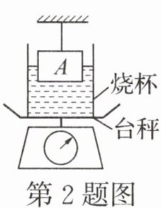 2. (2025·四川泸州二模)如图所示,台秤上放置一个装有适量水的烧杯(烧杯质量不计),已知水的质量为 600 g,烧杯的底面积为 100 cm²,将一个质量为 800 g、体积为 1 000 cm³ 的实心长方体 A 用细线系着,将其一半浸入烧杯的水中,此时 A 受到的浮力为