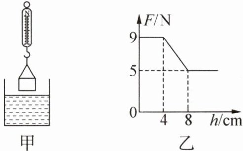 3. (2025·河南郑州期末)测量浮力大小时,小明将挂在弹簧测力计下的长方体物块,从盛水烧杯水面上方某一高度缓缓降落,将其逐渐浸入水中,忽略水面变化,如图甲所示。如图乙所示是弹簧测力计示数 $ F $ 随物块下降高度 $ h $ 变化的图像。由图可知,物块受到的最大浮力是