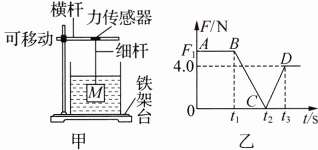 2. (2025·四川广元)如图甲所示,横杆在铁架台上可上下移动,竖直硬质细杆(质量忽略)的上端通过力传感器固定在横杆上(力传感器可显示细杆受到力的大小),下端与底面积为 $ 40\,\mathrm{cm}^2 $、密度为 $ 0.4\,\mathrm{g/cm}^3 $ 的实心均匀长方体物块 $ M $ 相连,$ M $ 浸没在底面积为 $ 100\,\mathrm{cm}^2 $ 装有水的容器中,此时水的深度为 $ 40\,\mathrm{cm} $。让横杆匀速缓慢向上移动,力传感器示数 $ F $ 随时间 $ t $ 的变化关系如图乙所示,$ t_2 ∼ t_3 $ 时间段为 $ 6\,\mathrm{s} $;物块 $ M $ 始终竖直且不吸水,水的密度是 $ 1.0\,\mathrm{g/cm}^3 $,$ g $ 取 $ 10\,\mathrm{N/kg} $。下列说法正确的是(