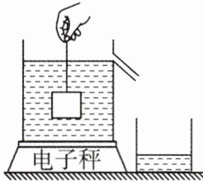 1. 如图所示,电子秤上有一底面积为 $ 100\,\mathrm{cm}^2 $ 的圆柱形平底溢水杯(不计厚度),杯中未装满水,将质量为 $ 500\,\mathrm{g} $、密度为 $ 5× 10^3\,\mathrm{kg/m}^3 $ 的圆柱形金属块用细线系住,从金属块下表面接触水面到金属块浸没水中直至沉底的过程中,电子秤示数增加了 $ 2\,\mathrm{N} $,此时细线的拉力为 $ 2.5\,\mathrm{N} $。下列说法正确的是($ g $ 取 $ 10\,\mathrm{N/kg} $,$ \rho_{\mathrm{水}} = 1.0× 10^3\,\mathrm{kg/m}^3 $)(