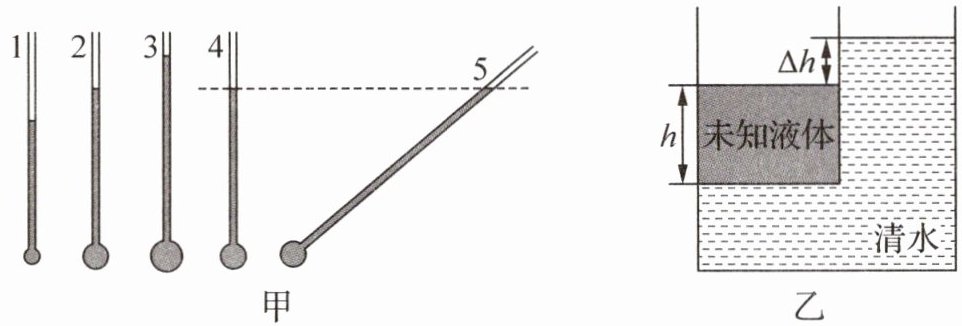 ② 在外部大容器内装入清水, 直到橡皮膜变平, 测出未知液体深度 h 以及清水与未知液体的液面高度差$\Delta h$.
