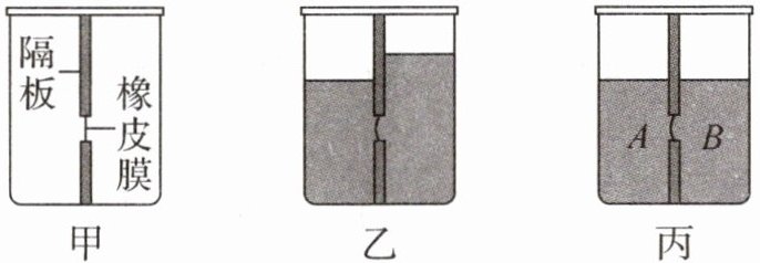 ① 将同一液体倒入容器左、右两侧, 使右侧液面高于左侧, 观察橡皮膜的形状如图乙. 再将 A、B 两种不同的液体 ($\rho_{A} < \rho_{B}$) 分别倒入容器左、右两侧, 使两侧的液面相平, 此时橡皮膜的形状如图丙.