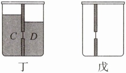 ② 若将 C、D 两种不同的液体分别倒入容器左右两边, 如图丁所示, 发现橡皮膜的形状几乎没有变化. 由此可知两种液体的密度大小关系: $\rho_{C}$