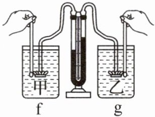 (8) 实验结束后, 善于动手的小明改装了液体压强计, 将 U 形管的两端都分别连接了软管和探头, 当两探头置于空气中时, U 形管内液面相平. 接下来, 小明将两个探头置于装有密度为$\rho_{甲}$、$\rho_{乙}$液体的 f、g 容器中, 当探头所处深度相同时, U 形管的液面位置如图 f、g 所示, 则$\rho_{甲}$