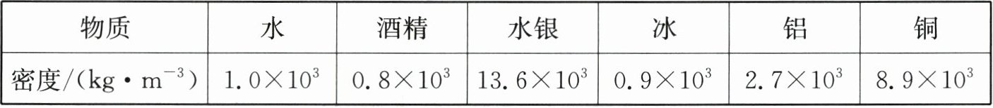 6. 小红根据下表所提供的物质的密度(常温常压下)得出四个结论,其中正确的是(