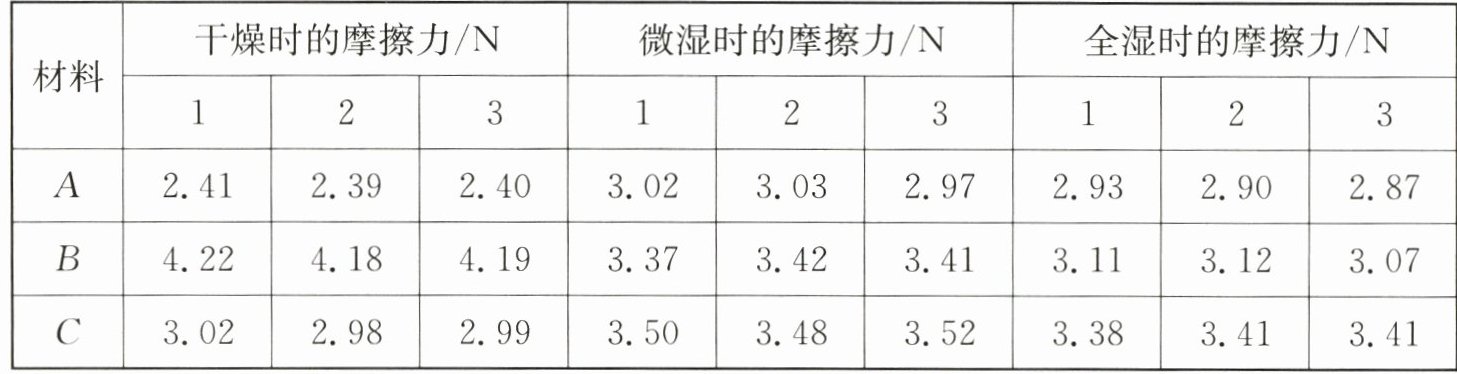 (3)鞋子在材料B上所受的滑动摩擦力大小与地板潮湿程度的关系为