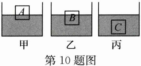 10. 如图,放在水平桌面上的三个完全相同的容器内装有适量的水,将A、B、C三个体积相同的正方体分别放入容器内,待正方体静止后,三个容器内水面高度相同。下列说法正确的是(