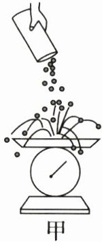 模拟以下操作:使一粒滚珠从距秤盘10cm的高度处落到秤盘上,秤的指针会略微摆动一下;在相同的高度处使100粒(或更多)滚珠持续、均匀地落到秤盘上(如图甲),秤的指针会在一个位置附近摆动;如果从更高处释放滚珠,滚珠与秤盘碰撞的速度变大,秤的示数会更大。以上现象说明大量滚珠撞击秤盘,对秤盘产生了持续、均匀的压力。在一定时间内,释放的滚珠越多,滚珠释放的高度越高,对秤盘产生的压力越大。
