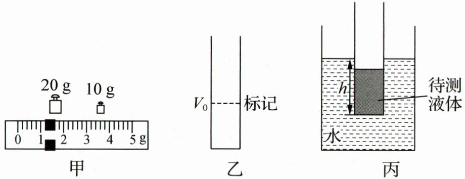 (3) 标记刻度线和密度值:如图丙所示,向圆筒内倒入待测液体至标记处,使待测液体体积为V₀.将圆筒放入水中处于竖直漂浮状态,测量圆筒浸入水中的深度h,则待测液体的密度ρ_液=