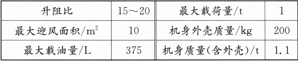 如表为该无人机的部分参数.升阻比是指飞机所受空气的升力与阻力的比值.飞机飞行时的空气阻力与迎风面积、飞行速度的平方均成正比.