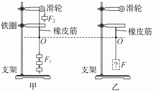 四 如图所示是探究“同一直线上的两个力的合成”的实验情景.图甲中,橡皮筋下端系有两根细线,其中一根细线上挂三个钩码(等效为拉力 $ F_{1} $),另一根细线向上跨过滑轮后挂一个钩码(等效为拉力 $ F_{2} $),此时橡皮筋下端伸长到 O 点;图乙中,仅在橡皮筋下端的细线上挂钩码(等效为拉力 F).