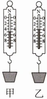 答案:11. $0.8 × 10^{3}$ 均匀 2 减小塑料杯的容积 解析:由图甲知,测力计示数$F_{甲} = 5\ N$,且$F_{甲} = G_{水} = m_{水}g$,所以杯中水的质量$m_{水} = \frac{G_{水}}{g} = \frac{5\ N}{10\ N/kg} = 0.5\ kg$,塑料杯的容积$V = V_{水} = \frac{m_{水}}{\rho_{水}} = \frac{0.5\ kg}{1.0 × 10^{3}\ kg/m^{3}} = 5 × 10^{-4}\ m^{3} = 500\ cm^{3}$.由图乙知,测力计示数$F_{乙} = 4\ N$,且$F_{乙} = G_{液} = m_{液}g$,所以杯中液体的质量$m_{液} = \frac{G_{液}}{g} = \frac{4\ N}{10\ N/kg} = 0.4\ kg$,液体的体积等于塑料杯的容积,液体的密度$\rho_{液} = \frac{m_{液}}{V_{液}} = \frac{m_{液}}{V} = \frac{0.4\ kg}{5 × 10^{-4}\ m^{3}} = 0.8 × 10^{3}\ kg/m^{3}$.液体的密度$\rho_{液} = \frac{m_{液}}{V_{液}} = \frac{m_{液}}{V} = \frac{G_{液}}{gV}$,由力的平衡可知,$\rho_{液} = \frac{F_{示}}{gV}$,塑料杯的容积不变,所以$\rho_{液}$与$F_{示}$成正比,此“密度秤”的刻度是均匀的.由题意知装满其他液体时液体的最大重力为$10\ N$,则最大质量$m_{最大} = \frac{G_{最大}}{g} = \frac{10\ N}{10\ N/kg} = 1\ kg$,最大密度$\rho_{液最大} = \frac{m_{最大}}{V_{液}} = \frac{m_{最大}}{V} = \frac{1\ kg}{5 × 10^{-4}\ m^{3}} = 2 × 10^{3}\ kg/m^{3} = 2\ g/cm^{3}$;由$\rho_{液} = \frac{F_{示}}{gV}$可知,测力计的最大示数一定时,若塑料杯的容积$V$变小,则所测液体最大密度将变大,故想增大该“密度秤”的量程可减小塑料杯的容积.