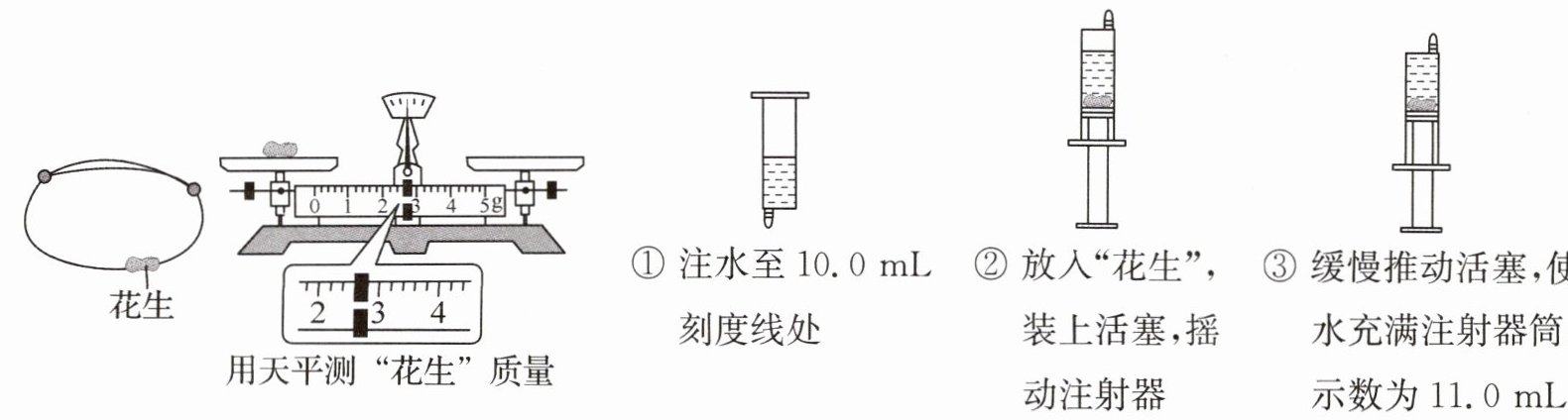 (2) 因“花生”体积较小,选择分度值更小的注射器来测“花生”体积.其步骤如图①②③,步骤②中摇动注射器的目的是