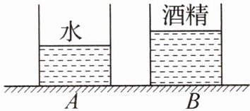 5. (8分)如图所示,两个完全相同的圆柱形容器A和B放在水平桌面上,容器的底面积为$2×10^{-2}$m²,容器内水的深度为0.2m,且两容器中水和酒精的质量相等.(已知$\rho_{酒精}=0.8×10^{3}$kg/m³,$\rho_{水}=1.0×10^{3}$kg/m³,$\rho_{铁}=7.9×10^{3}$kg/m³,$\rho_{铝}=2.7×10^{3}$kg/m³)