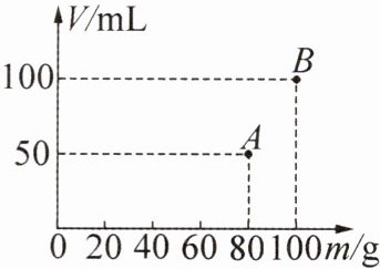 答案:6.B 解析:由图像可知,当水和烧杯总质量$m_1=80\mathrm{ g}$,水的体积$V_1 = 50\mathrm{ mL}=50\mathrm{ cm}^3$;当未知液体和烧杯总质量$m_2 = 100\mathrm{ g}$,液体的体积$V_2 = 100\mathrm{ mL}=100\mathrm{ cm}^3$;设烧杯的质量为$m_{杯}$,由$\rho=\frac{m}{V}$可得,$m_{杯}+m_{水}=m_{杯}+\rho V_1 = m_1$,代入数据得$m_{杯}+1.0\mathrm{ g/cm}^3×50\mathrm{ cm}^3 = 80\mathrm{ g}$,同理可得$m_{杯}+\rho_{液}×100\mathrm{ cm}^3 = 100\mathrm{ g}$,解得$m_{杯}=30\mathrm{ g}$,未知液体的密度$\rho_{液}=0.7\mathrm{ g/cm}^3$,由此可知,该液体不是水,故A、C错误,B正确;$100\mathrm{ cm}^3$该液体的质量$m_{液}=\rho_{液}V_{液}=0.7\mathrm{ g/cm}^3×100\mathrm{ cm}^3 = 70\mathrm{ g}$,故D错误.