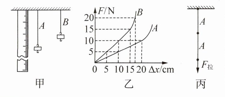 10.(6 分)某实验小组的同学对$A$、$B$两根长度相同、粗细不同的橡皮筋进行研究,并做成橡皮筋测力计,将橡皮筋的一端固定,另一端悬挂钩码(如图甲所示),记录橡皮筋受到的拉力大小$F$和橡皮筋伸长量$\Delta x$,根据多组测量数据作出的图线如图乙所示.