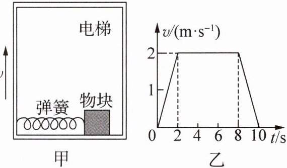 8.(2025·江苏镇江期末·3 分)如图甲所示,物块静止在水平的电梯底部,其左侧通过轻质弹簧与电梯壁相连,且弹簧处于水平压缩状态,当电梯由静止开始竖直向上运动,其速度与时间的关系图像如图乙所示.若在$0∼10\ \mathrm{s}$内,物块相对电梯保持静止,物块对电梯底部的压力大小